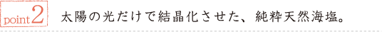 | 1 0 0%深層海水を加熱処理せず、遠赤外線を発するセラミック敷塩田でひたすら太陽の光だけで天日結晶。さらに細かな結晶にするため、広大な塩田を繰り返し人の手によりかき混ぜるという、気の遠くなるような職人技の工程がなされています。さらに1年間も熟成させるから、驚くほどまろやかな味になるのです。しかもチェック工程では、機械を使うと熱によって成分が変化するので全て手作業で行うこだわりぶり。これこそ「純粋な天然海塩」と呼ぶにふさわしい塩です。 |